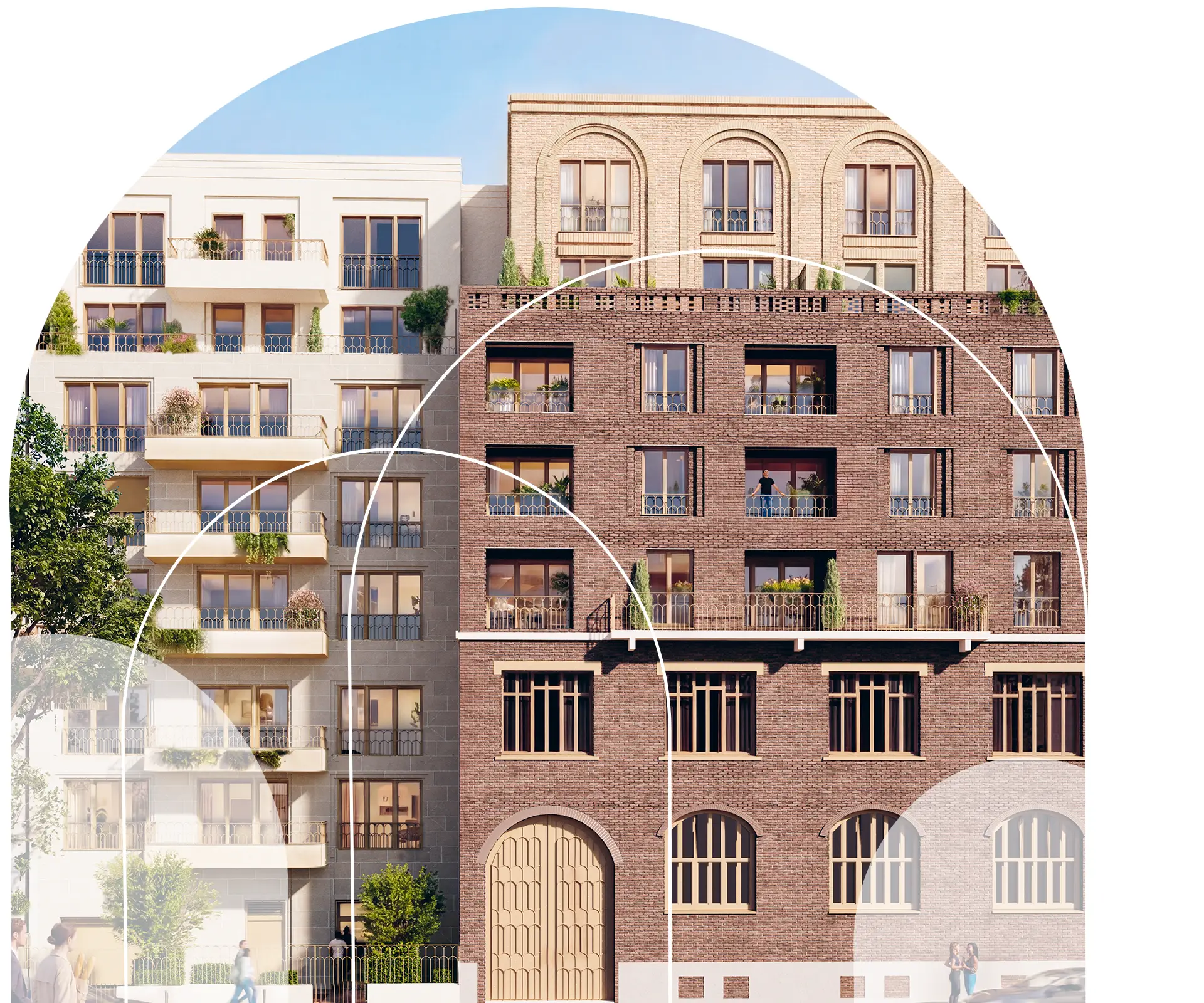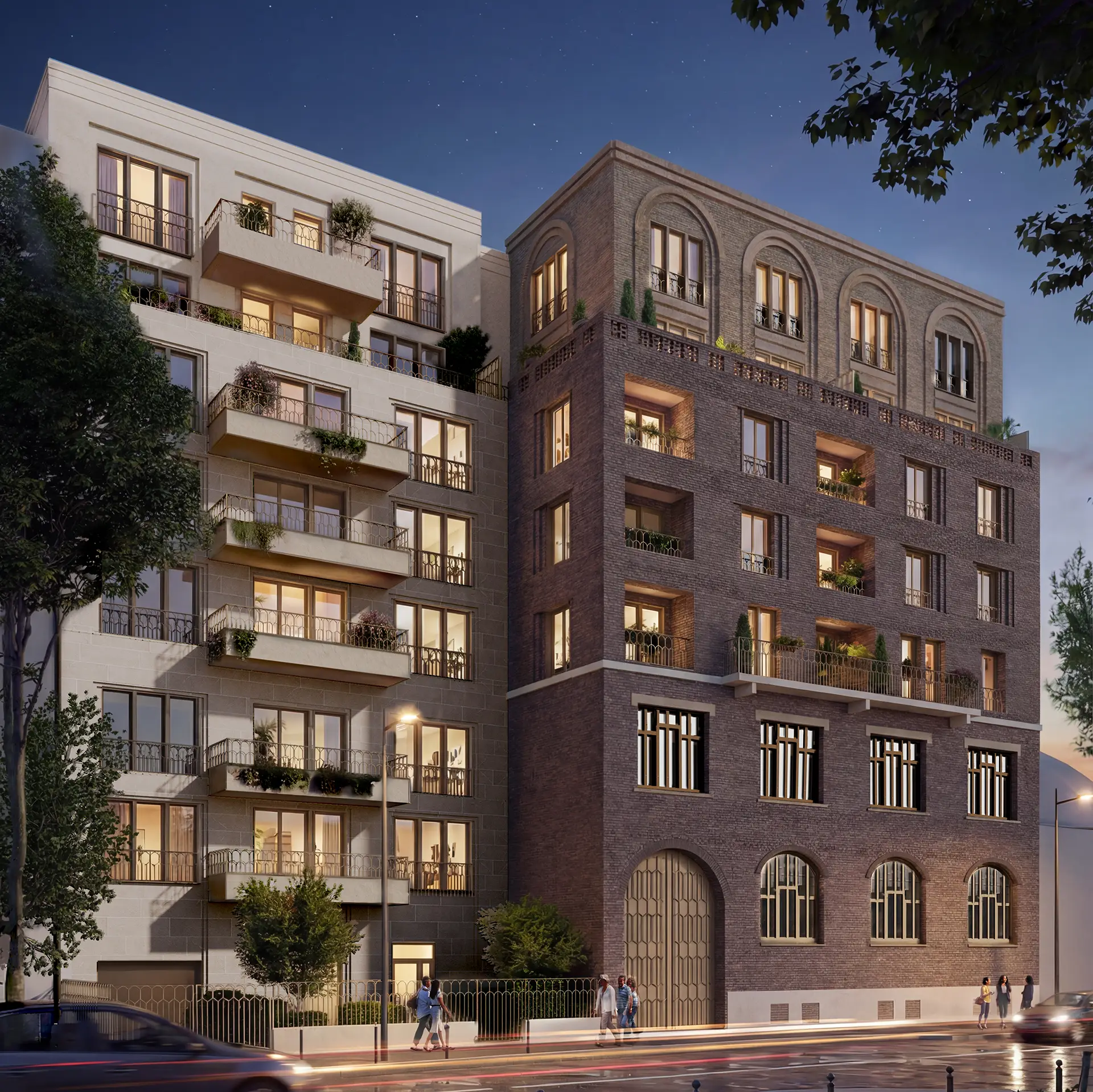 En léger retrait, la construction neuve s’exprime dans une écriture plus contemporaine : lignes sobres, balcons en saillie ou filants et teintes minérales.