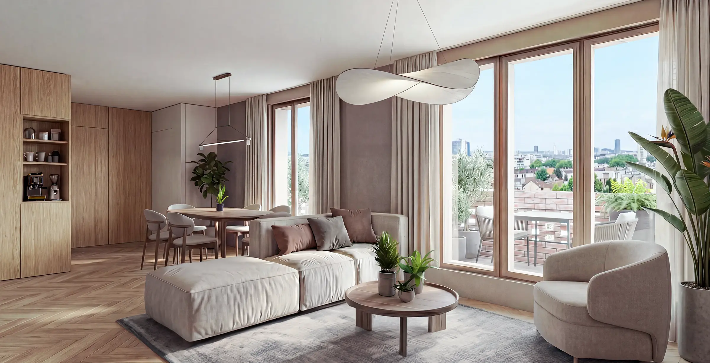 Les séjours prolongés par des cuisines ouvertes offrent de larges volumes baignés de lumière naturelle.