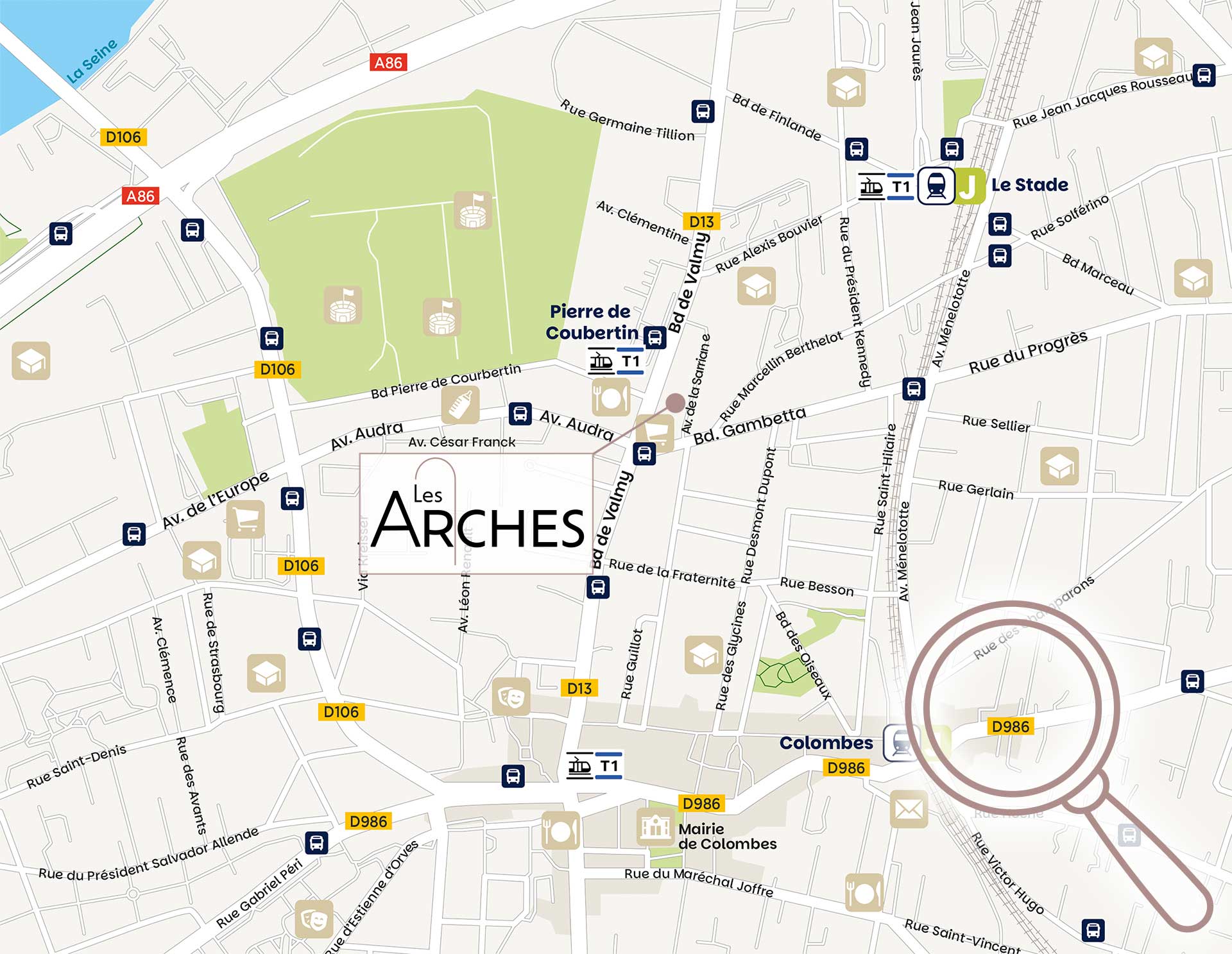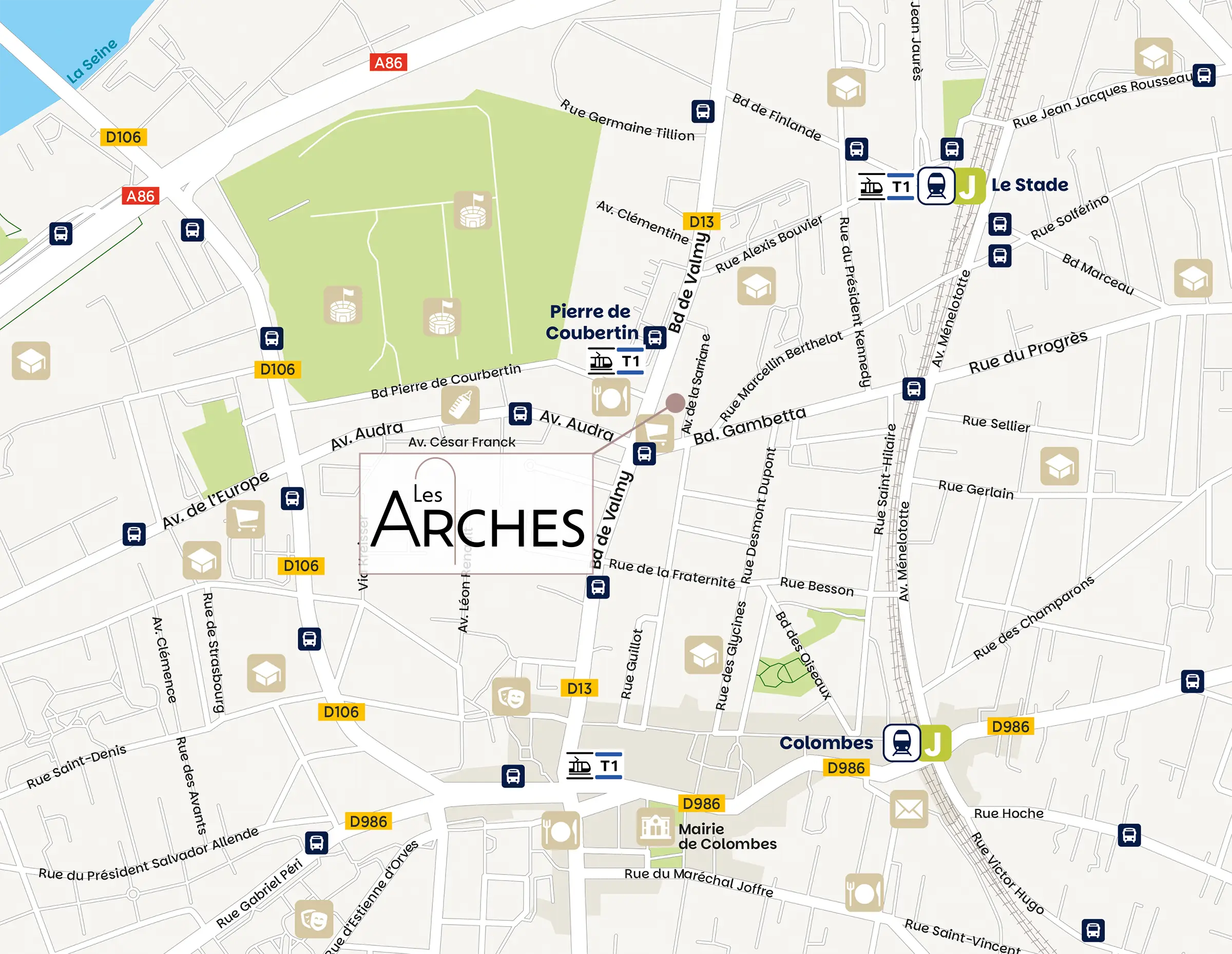 À deux pas de La Défense et de Paris, elle bénéficie d’un maillage de transports remarquables : lignes de train J et L, tramways T1 (arrêt Pierre de Coubertin en face de la résidence) et T2 ainsi que les axes routiers majeurs.